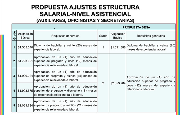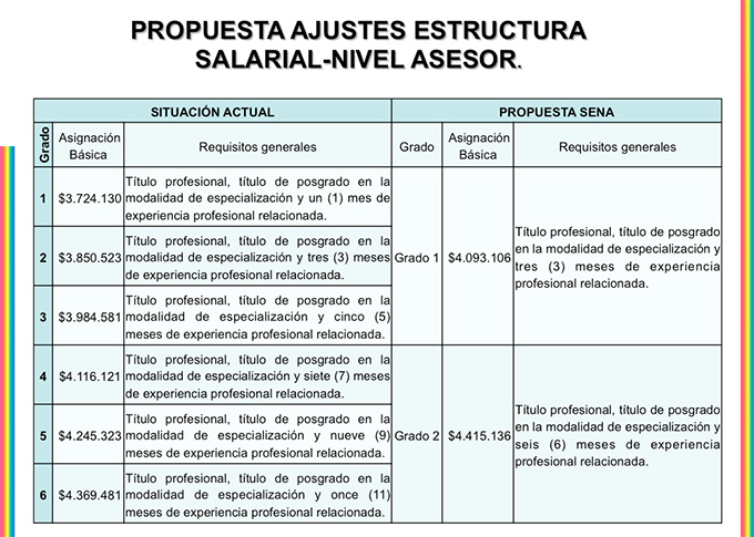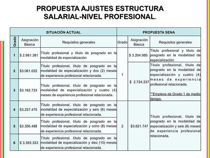 Y dada la inminencia del mismo, consideramos oportuno compartir algunos elementos fundamentales del estudio en mención, relacionados con el achatamiento de la planta, el cual consiste en un ajuste en el sistema de nomenclatura, clasificación y remuneración de los empleos públicos del SENA, reduciendo en todos los niveles, los actuales grados salariales, así como el ajuste en los requisitos de empleos y las asignaciones básicas.