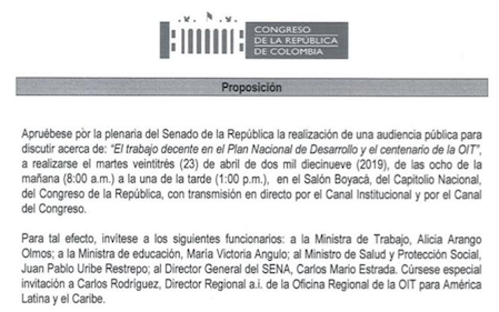 PROPOSICIÓN COMISIÓN CUARTA SENADO CITACIÓN AUDIENCIA