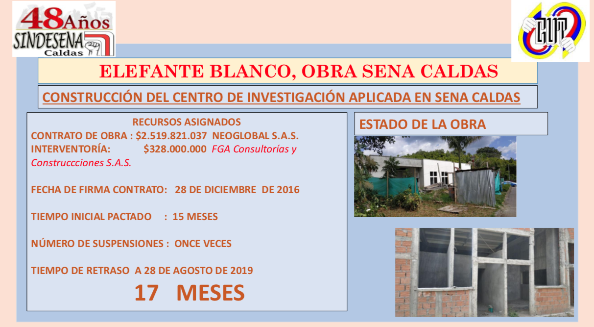 En un gran ELEFANTE BLANCO se ha convertido la CONSTRUCCIÒN DEL CENTRO DE INVESTIGACIÒN APLICADA firmado desde el 27 de Diciembre de 2016, mediante contrato 001416 entre el SENA REGIONAL CALDAS y la empresa NEOGLOBAL S.A.S. inicialmente por $1.716.924.771 con adiciones por más de $800.000.000 cuya Interventoría es de FGA Consultorías y Construccciones S.A.S….
