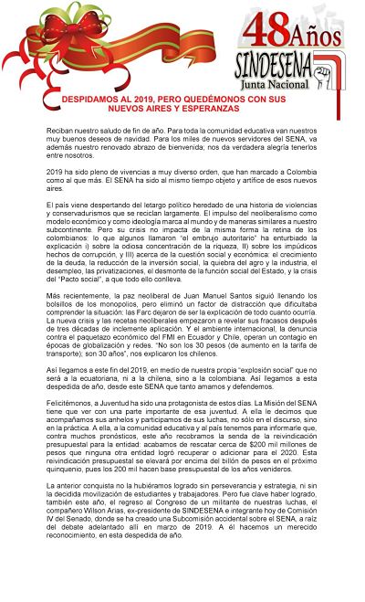 Reciban nuestro saludo de fin de año. Para toda la comunidad educativa van nuestros muy buenos deseos de navidad. Para los miles de nuevos servidores del SENA, va además nuestro renovado abrazo de bienvenida; nos da verdadera alegría tenerlos entre nosotros