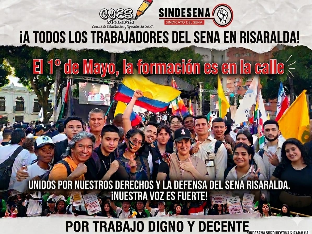 La Subdirectiva SINDESENA y el COES Risaralda convocan a toda la comunidad del SENA a movilizarse masivamente este Día Internacional de los Trabajadores. Nuestras acciones siguen arrojando resultados tangibles frente a la precarización. Si usted quiere seguir teniendo un buen empleo y un buen salario, salga a marchar con nosotros.