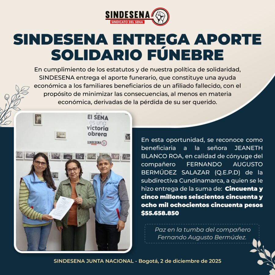 En cumplimiento de los estatutos y de nuestra política de solidaridad, SINDESENA entrega el aporte funerario, que constituye una ayuda económica a los familiares beneficiarios de un afiliado fallecido, con el propósito de minimizar las consecuencias, al menos en materia económica, derivadas de la pérdida de su ser querido.
