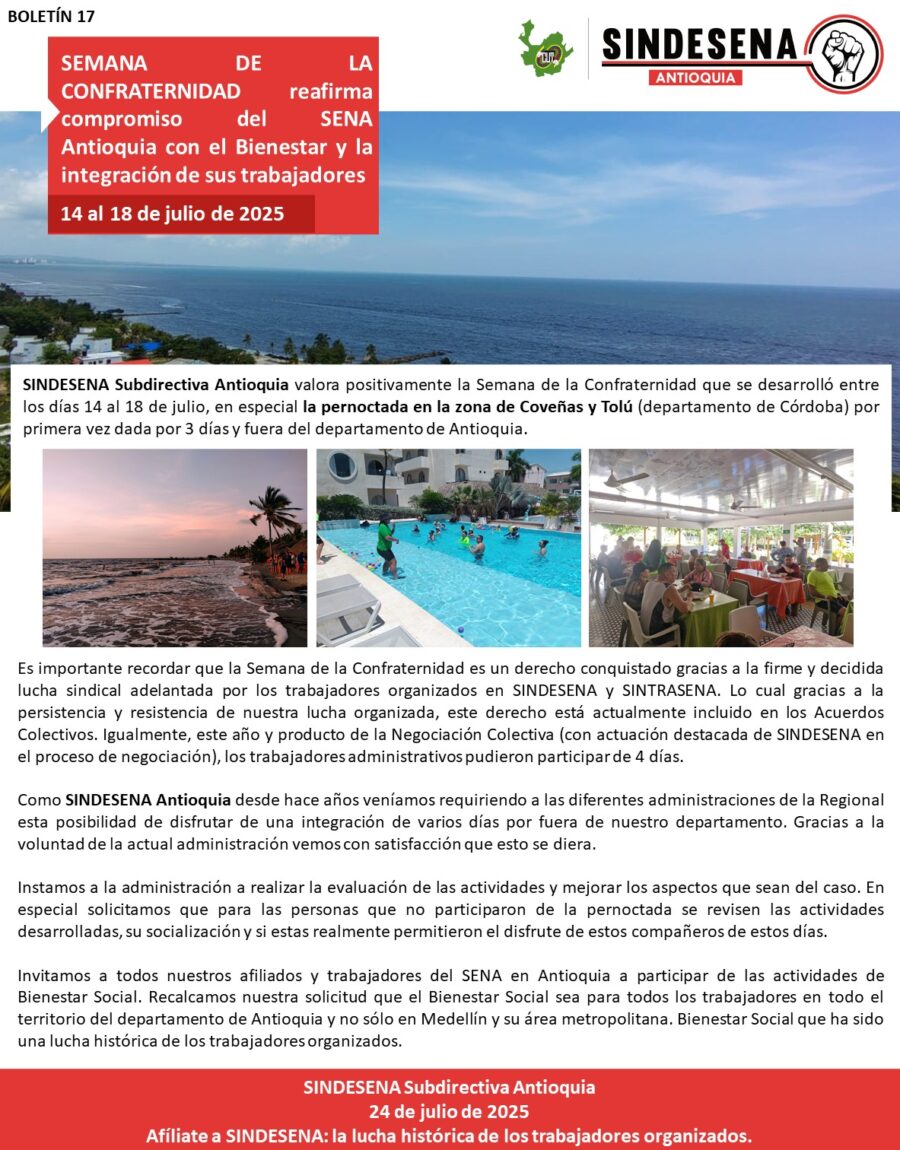 Gracias a la gestión de SINDESENA, con el apoyo del Comité de Asuntos Estudiantiles de la Junta Nacional, se logró la instalación de la mesa técnica de asuntos de los aprendices, la cual está articulada con la Dirección de Formación Profesional del SENA. Este constituye un avance significativo para la organización sindical, ya que en…