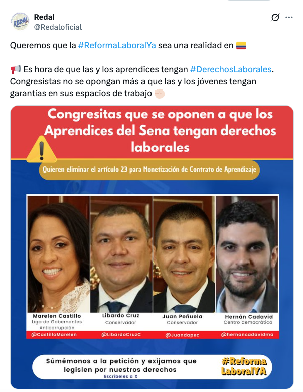 📢 Es hora de que las y los aprendices tengan #DerechosLaborales. Congresistas no se opongan más a que las y los jóvenes tengan garantías en sus espacios de trabajo ✊🏻 pic.twitter.com/D09bQI8JXI
