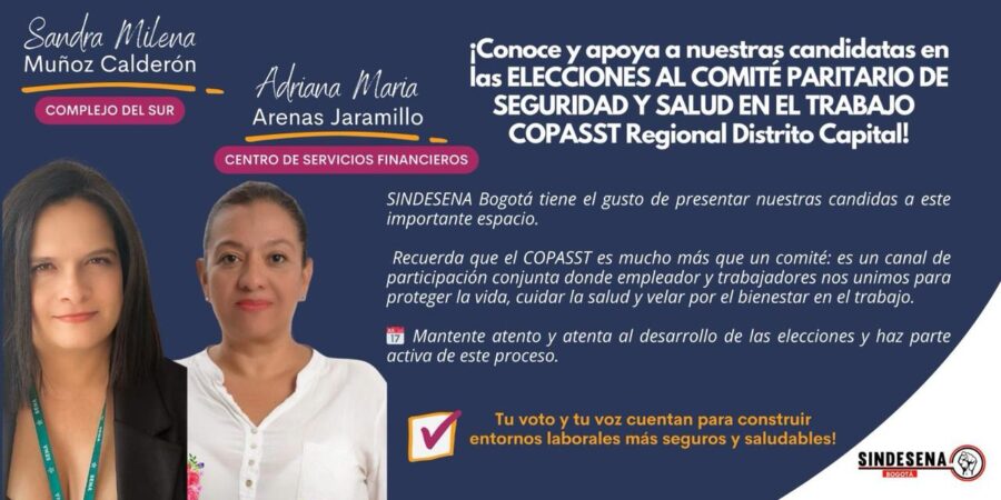 📢 Desde SINDESENA Bogotá nos enorgullece presentar a nuestras candidatas al Comité Paritario de Seguridad y Salud en el Trabajo (COPASST) Regional Distrito Capital. un espacio fundamental donde empleador y trabajadores nos unimos para proteger la vida, cuidar la salud y promover el bienestar en nuestro entorno laboral.