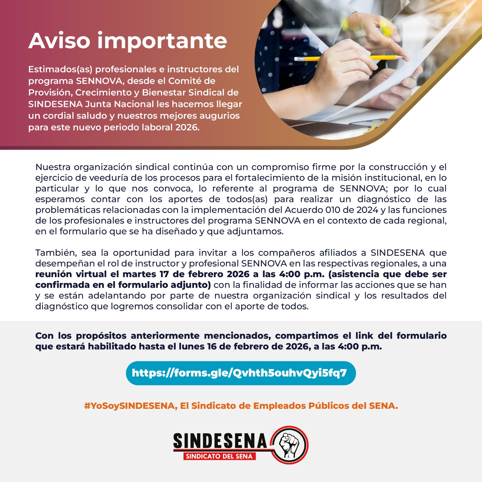 También, sea la oportunidad para invitar a los compañeros afiliados a SINDESENA que desempeñan el rol de instructor y profesional SENNOVA en las respectivas regionales, a una reunión virtual el miércoles 17 de febrero 2026 a las 4:00pm (asistencia que debe ser confirmada en el formulario adjunto) con la finalidad de informar las acciones que se han y se están adelantando por parte de nuestra organización sindical y los resultados del diagnostico que logremos consolidar con el aporte de todos.