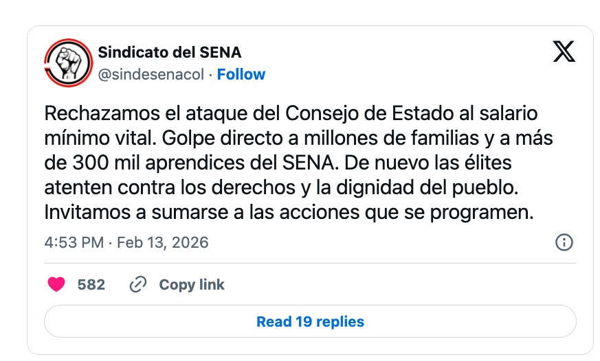 Rechazamos el ataque del Consejo de Estado al salario mínimo vital. Golpe directo a millones de familias y a más de 300 mil aprendices del SENA. De nuevo las élites atenten contra los derechos y la dignidad del pueblo. Invitamos a sumarse a las acciones que se programen.