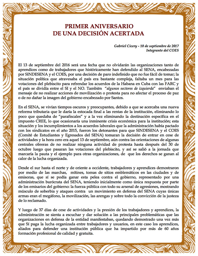 Con alegría por la satisfacción del deber cumplido, desde SINDESENA Valle, recordamos aquel 13 de septiembre de 2016 como una fecha histórica, porque ese día inició el paro de 37 días que dio lugar a los acuerdos del 19 de octubre del mismo año, y hoy un año después, celebramos los frutos que se recogen: planta de personal ampliada y nivelación salarial…