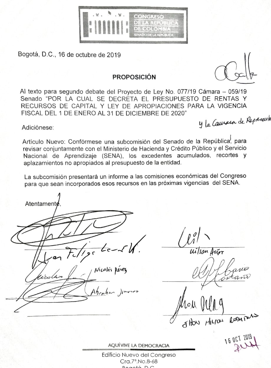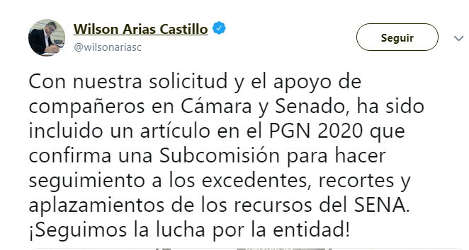 En el marco de la aprobación en segundo debate del Presupuesto General de la Nación, nuevamente el Senador Wilson Arias presentó con el apoyo de varios senadores, una proposición que finalmente fue aprobada tanto en Cámara como en Senado, para que se creara una nueva Subcomisión, la cual quedaría incluida en el articulado del Presupuesto General de la Nación 2020 y que se podría convertir en una instancia que haga seguimiento al presupuesto del SENA e impida recortes o aplazamientos al tiempo que revise y acompañe la reclamación de los dineros dejados de entregar al SENA