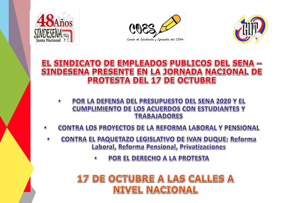 En cumplimiento de las directrices emanadas de la Central Unitaria de Trabajadores – CUT en el marco del Encuentro Nacional de Emergencia del Movimiento Social, Sindical y Estudiantil; orientamos a todos los afiliados al Sindicato de Empleados Públicos del Sena – SINDESENA a nivel Nacional y en particular a toda la comunidad Sena, a sumarnos y participar en la Jornada de Movilización convocada para mañana 17 de octubre de 2019…