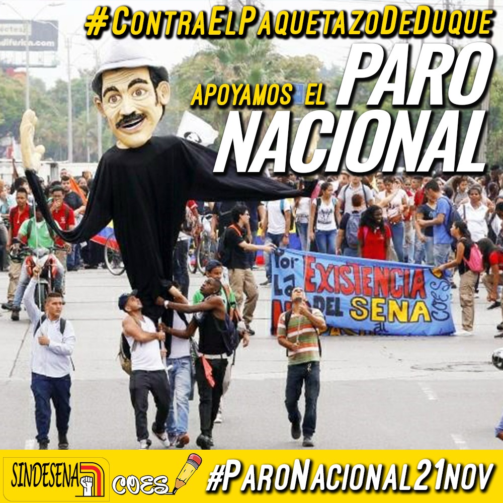 La Junta Nacional de SINDESENA, ratifica convocatoria a toda la comunidad educativa a participar activamente en el PARO NACIONAL del 21 de noviembre, convocado por las Centrales Obreras CUT, CTC, CGT, CPC y más de 100 organizaciones sindicales y sociales desde el pasado mes de octubre.
