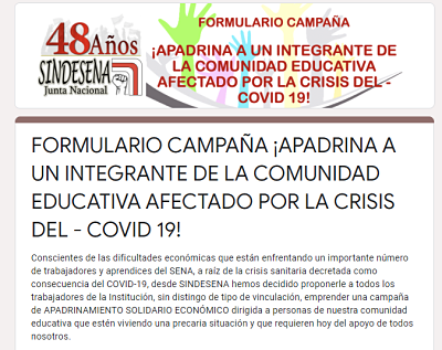 Como lo informamos en dicha circular, la campaña de solidaridad promovida por SINDESENA se empezó a ejecutar desde el mes de mayo, arrojando importantes resultados, como el apadrinamiento de más de 80 integrantes de la comunidad educativa que reciben apoyo económico desde esa fecha.