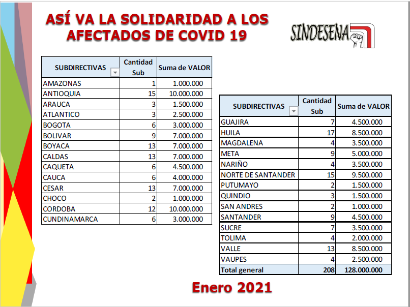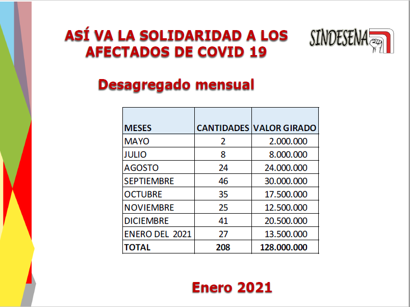 Desde el mes de mayo del año anterior, nuestra organización sindical SINDESENA, decidió otorgar apoyos económicos a los afiliados y sus familias que hubieran sido afectados por el COVID 19. Para cumplir con este objetivo, se emitieron orientaciones a las subdirectivas en las diferentes regionales con instrucciones precisas de hacer acompañamiento a las situaciones que se presentaran con los afectados por este virus, de tal manera que pudieran acceder a nuestra solidaridad