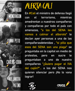 Con gran indignación expresamos nuestro rechazo al vil mal trato por parte de la fuerza pública de que han sido objeto un dirigente sindical de Sindesena Valle e integrantes del comité de estudiantes y egresados del SENA COES en varias partes del país, quienes han estado apoyando activamente las actividades de rechazo a la reforma tributaria y a las políticas del gobierno nacional en cabeza de Iván Duque, que ha tenido su máxima expresión desde el 28 de abril y a la que cada vez se suman más voces indignadas…