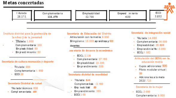 Mediante memorandos de entendimiento pretenden certificar 28.175 aprendices en formación titulada, 118.570 aprendices en formaciones complementarias, 52.700 en empleabilidad, 4.150 en emprendimiento y 5.832 certificaciones en competencias laborales a través de ocho (8) convenios aprobados por el Consejo Regional con la SECRETARIA DE LA MUJER, SECRETARIA DISTRITAL DE LA MOVILIDAD, SECRETARIA DE EDUCACIÓN DEL DISTRITO, SECRETARIA CULTURA RECREACIÓN Y DEPORTE, SECRETARIA DESARROLLO ECONÓMICO, SECRETARIA INTGERACIÓN SOCIAL, IDIPRON, SECRETARIA DISTRITAL DE SALUD.