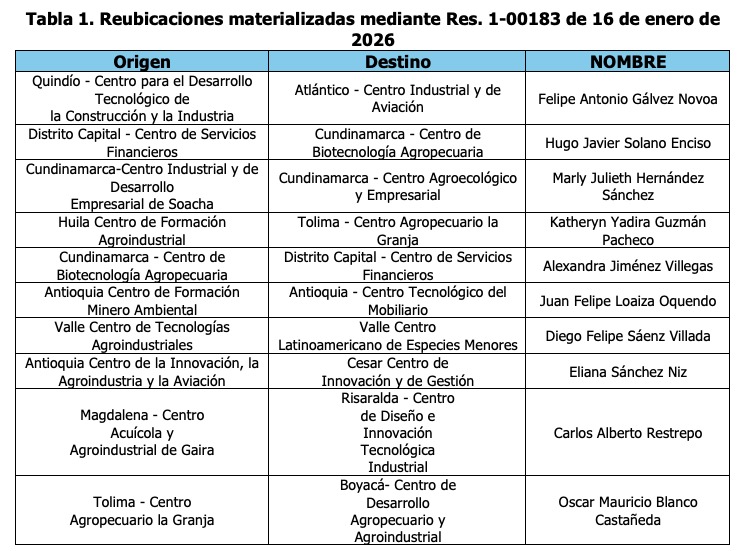 En un primer momento se revisaron los casos pendientes de expedición de resolución tras compromiso adquirido en la mesa del 13 de diciembre del 2025, donde se manifestó la materialización de 13 casos de reubicaciones de nuestros afiliados antes del 31 de diciembre y el cual fue cumplido parcialmente al 16 de enero de 2026 con la expedición de la Resolución 1-00183 que permitió materializar la reubicación de 10 compañeros (as) relacionados en la Tabla 1. (a los cuales le damos la bienvenida en nuestras diferentes subdirectivas destino).