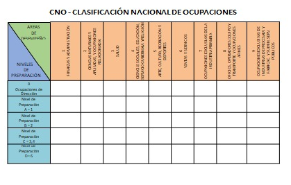 Una de las preocupaciones, es que dichas clasificaciones tienen estructuras diferentes. La Clasificación Nacional de Ocupaciones C.N.O es matricial, cruzando áreas de desempeño con nivel ocupacional y en la intersección encontramos las ocupaciones u oficios para cada área de desempeño sectorial (primario- industrial- servicios).