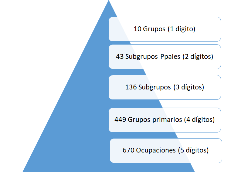 Mientras que, la CLASIFICACIÓN ÚNICA DE OCUPACIONES PARA COLOMBIA – CUOC– es piramidal, inicia desde el vértice superior con una agrupación de 10 grupos considerados los más altos de dirección, y de allí se subdividen en tres ramas sucesivas (subgrupos principales- subgrupos y grupos primarios). En la actualización que mencionan haber realizado para Colombia, al subgrupo más inferior le asignaron las ocupaciones que se encontraban en la CNO, (como dígito 5, ya que las agrupaciones más superiores, cubren los cuatro primeros dígitos)