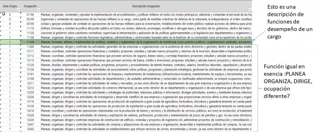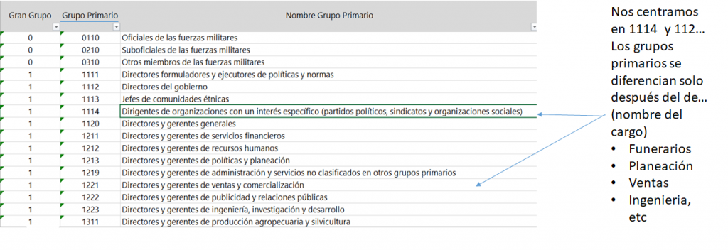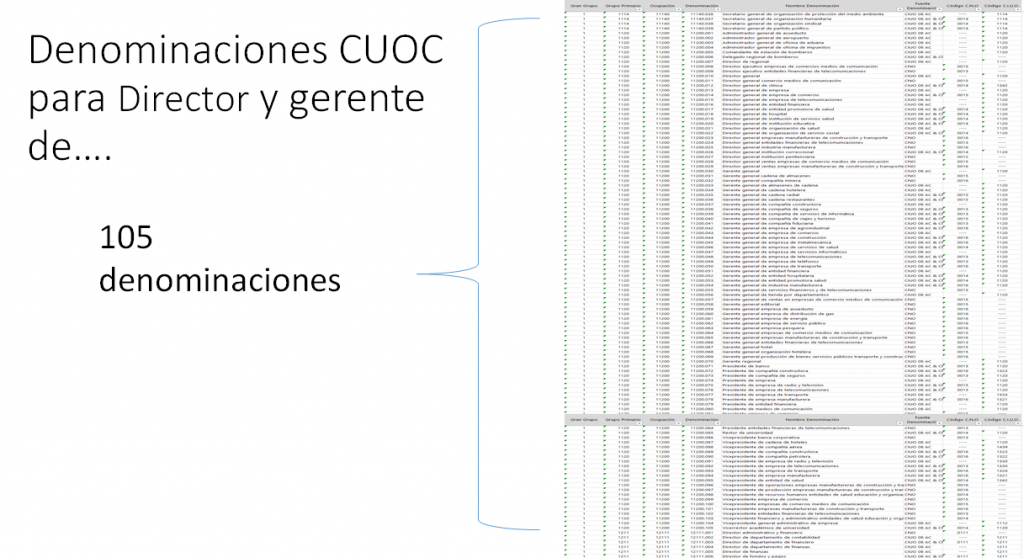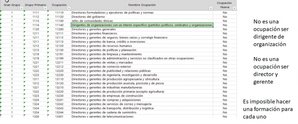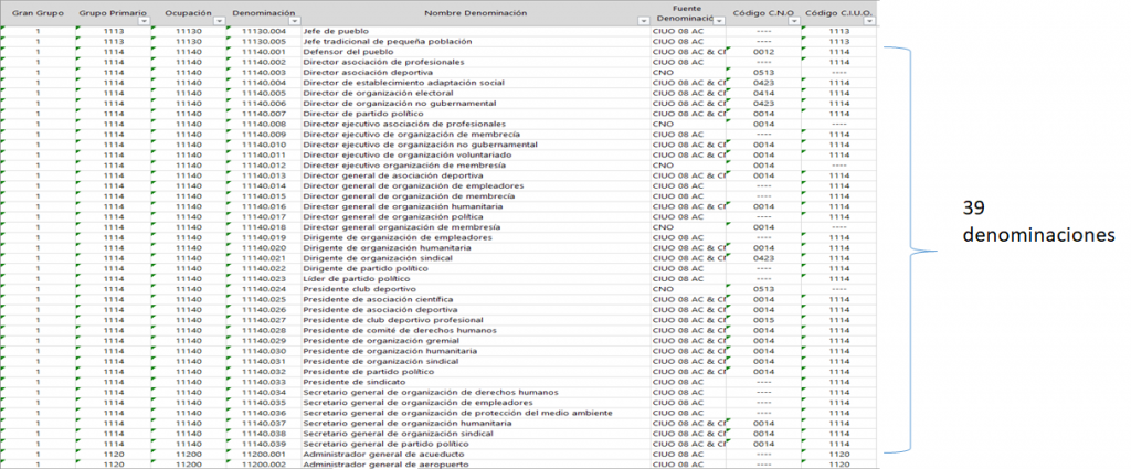 Al llegar a la denominación específica (que sería el objeto de interés del SENA) se encuentran múltiples denominaciones para una misma ocupación. No es posible estructurar una oferta de un programa de formación que corresponda a cada una de esas denominaciones: 39 para el caso de 11140: dirigente de organización con un interés específico y 105 denominaciones para el caso de 11200: directores y gerentes generales