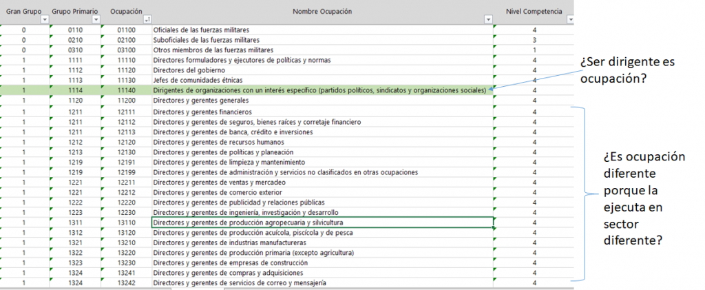 Este es el listado de lo que la CUOC establece como los grandes grupos que se encuentran en el vértice superior de la pirámide. Sin embargo, puede observarse que los grupos no poseen características excluyentes que permitan diferenciar claramente unos de otros, o que no se sobrepongan o contengan unos con otros. Ejemplo: El grupo 7 definido como Oficiales, operarios, artesanos y oficios relacionados, incluiría desde el carpintero raso, hasta el piloto de avión, pasando por los artesanos que incluirían a su vez desde el pintor de grafitis, hasta Miguel Angel, Botero, Caballero o Matador y todos clasificados con un nivel de competencia 2, que de acuerdo a la CUOC : “ Para la mayoría del conjunto de las ocupaciones del segundo nivel de competencias se debe: tener una capacidad de lectura básica para comprender información como instrucciones de seguridad, establecer por escrito registros del trabajo realizado y desempeñar con precisión cálculos aritméticos simples….. Las ocupaciones clasificadas en este nivel abarcan: carniceros, conductores de autobuses, secretarios, empleados de contabilidad, costureros, sastres y modistos, asistentes vendedores de tiendas y almacenes, policías, peluqueros, electricistas de obras y mecánicos de vehículos de motor, entre otras.