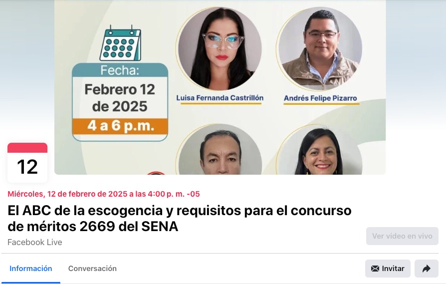 Te invitamos a unirte hoy a nuestro Facebook Live: El ABC de la escogencia y requisitos para el concurso de méritos 2669 del SENA. Si nos sigues, no solo podrás participar en vivo, sino que también sabremos que estás ahí, acompañándonos. ¡Es tu oportunidad de resolver todas tus dudas y no perderte ningún detalle! Te esperamos