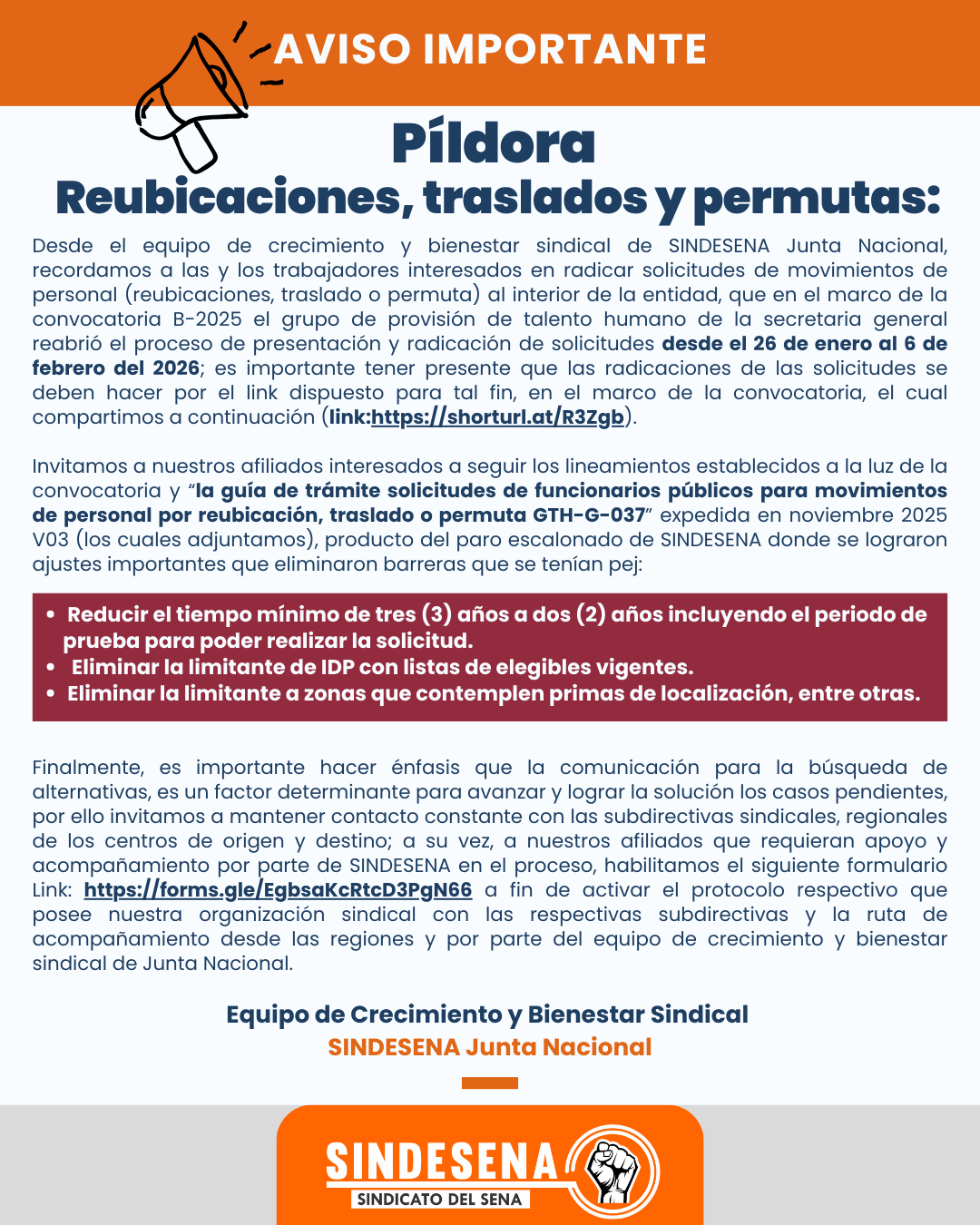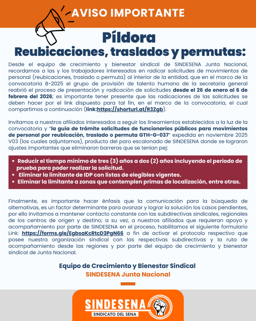 Desde el equipo de crecimiento y bienestar sindical de SINDESENA Junta Nacional, recordamos a los trabajadores interesados en radicar solicitudes de movimientos de personal (reubicación, traslado o permuta) al interior de la entidad, que en el marco de la convocatoria B-2025 el grupo de provisión de talento humano de la secretaria general reabrió el proceso de presentación y radicación de solicitudes desde el 26 de enero al 6 de febrero del 2026; es importante tener presente que las radicaciones de las solicitudes se deben hacer por el link dispuesto para tal fin, en el marco de la convocatoria, el cual compartimos a continuación (link: https://shorturl.at/R3Zgb).