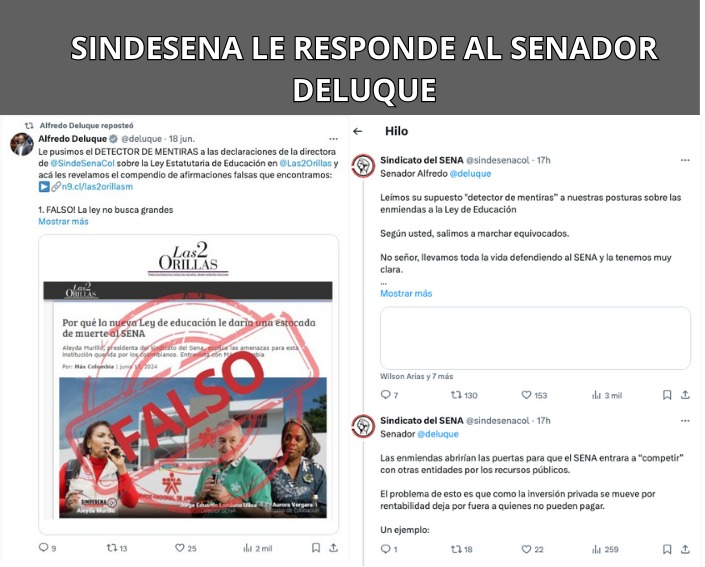 En publicación de X (antes Twitter) realizada por el senador Alfredo Rafael Deluque Zuleta se hace un «auto detector de mentiras» a las respuestas remitidas por SINDESENA indicando algunos inconvenientes del proyecto de ley estatutaria de educación al cuestionario enviado por la señora Natalia Robledo Escobar, quien dijo contactarnos en representación del canal de WhatsApp Más Colombia, información que posteriormente fue publicada por el portal Las 2Orillas, afirmando que las mismas son falsas, sin soportar con evidencias este «juicio».