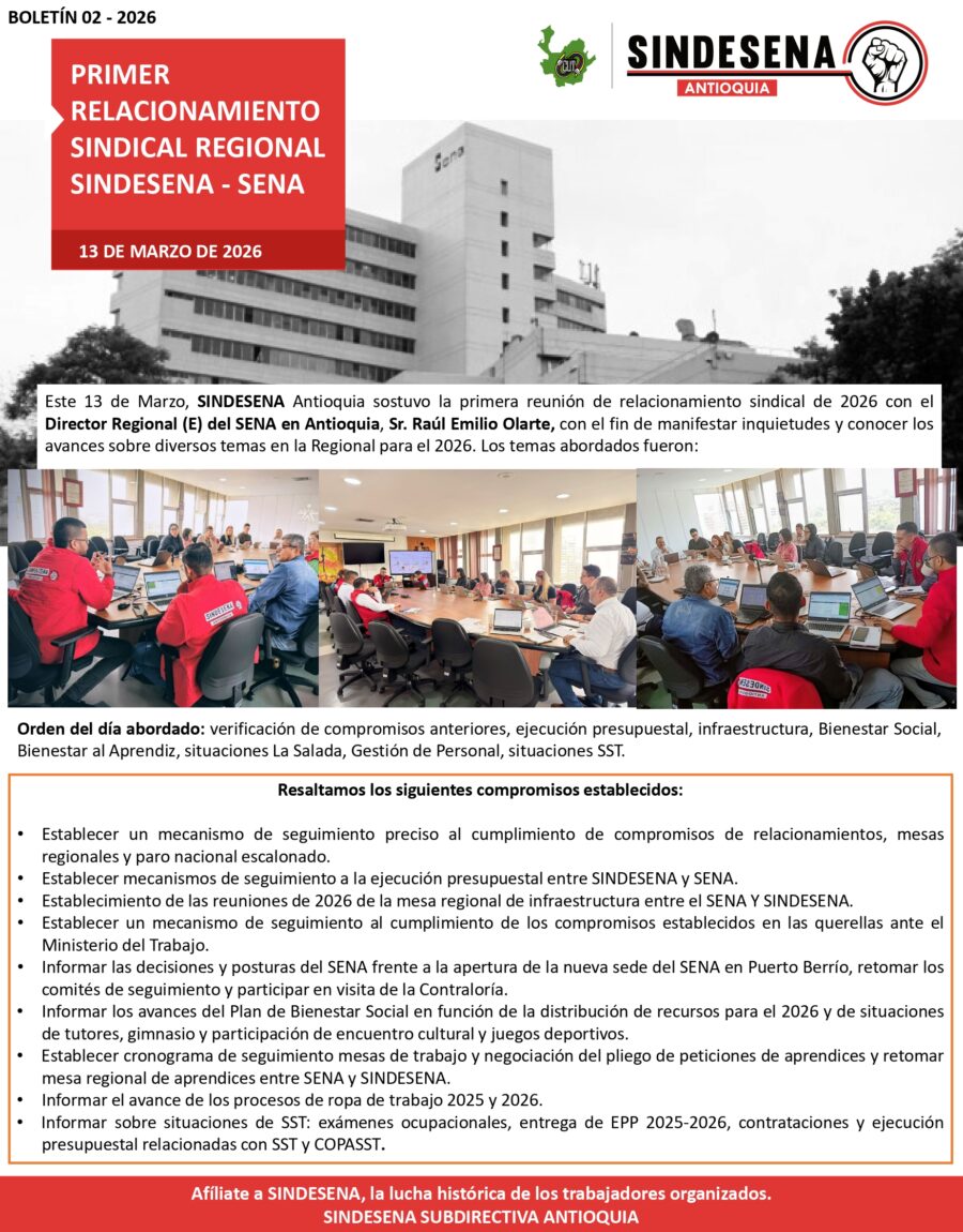 Este 13 de Marzo, SINDESENA Antioquia sostuvo la primera reunión de relacionamiento sindical de 2026 con el Director Regional (E) del SENA en Antioquia, Sr. Raúl Emilio Olarte, con el fin de manifestar inquietudes y conocer los avances sobre diversos temas en la Regional para el 2026. Los temas abordados fueron: