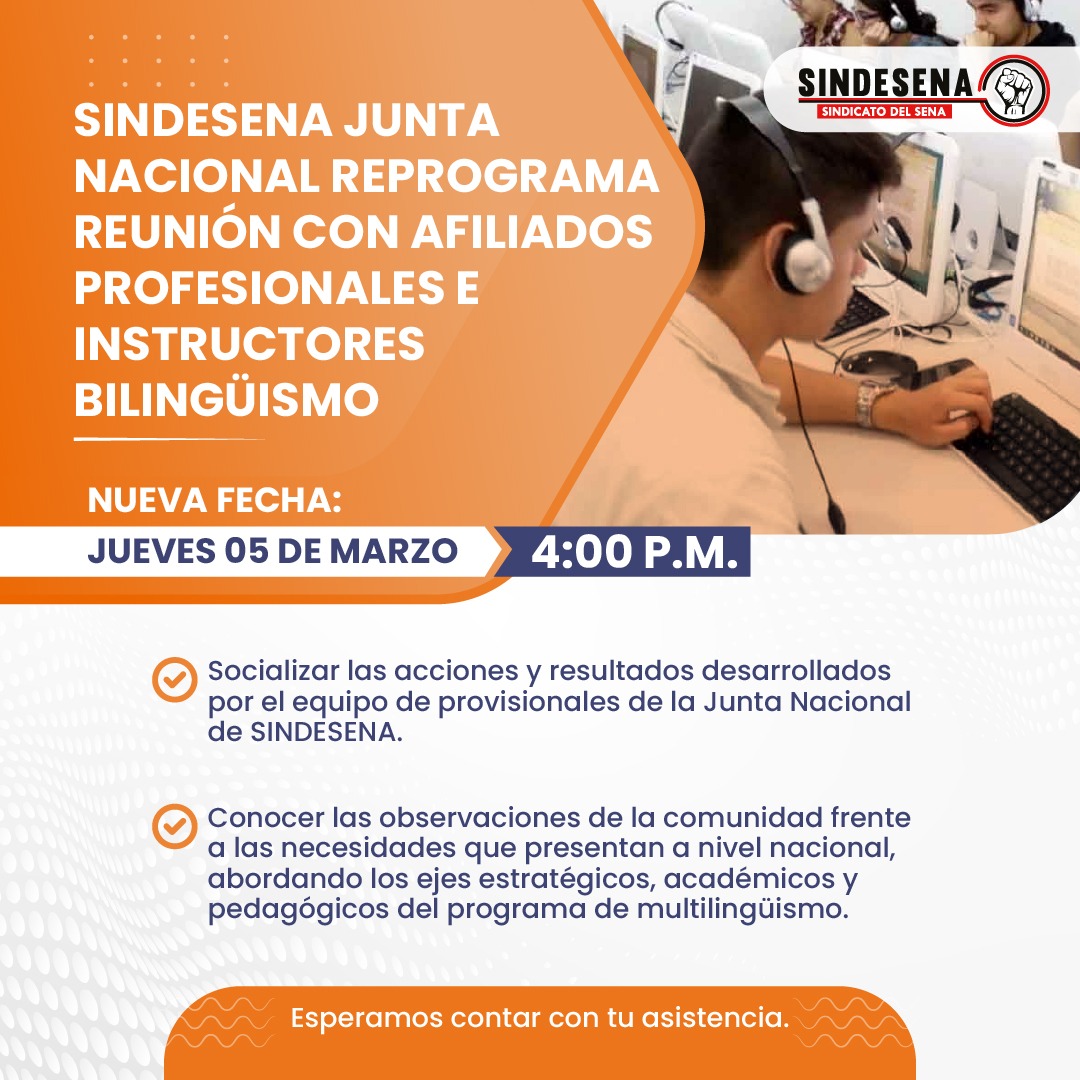 Sindesena Junta Nacional reprograma reunión con afiliados profesionales e instructores bilingüismo