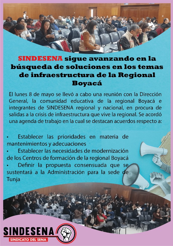 El lunes 8 de mayo se llevó a cabo una reunión con la Dirección General, la comunidad educativa de la regional Boyacá e integrantes de SINDESENA regional y nacional, en procura de salidas a la crisis de infraestructura que vive la regional. Se acordó una agenda de trabajo en la cual se destacan acuerdos respecto a: